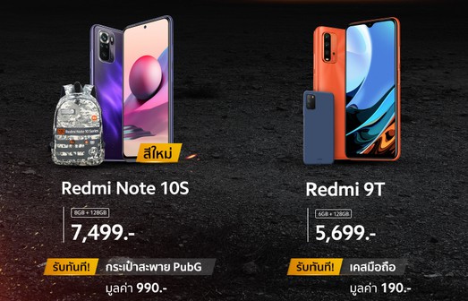 - Redmi Note 10S (8GB+128GB) โดดเด่นด้วยกล้องหลัง 4 ตัว ประกอบด้วยกล้องหลัก 64MP เลนส์อัลตราไวลด์และเลนส์มาโคร หน้าจอ AMOLED DotDisplay ขนาด 6.43 นิ้ว ชิปเซ็ต MediaTek Helio G95 และหน่วยประมวลผล Octa-Core Processor อันทรงพลัง มาพร้อมกับแบตเตอรี่ขนาดใหญ่ถึง 5000mAh (typ) รองรับการชาร์จเร็ว 33W ราคา 7,499 บาท รับทันที กระเป๋าสะพาย PUBG มูลค่า 990 บาท งานนี้สายเกมเมอร์ห้ามพลาด!