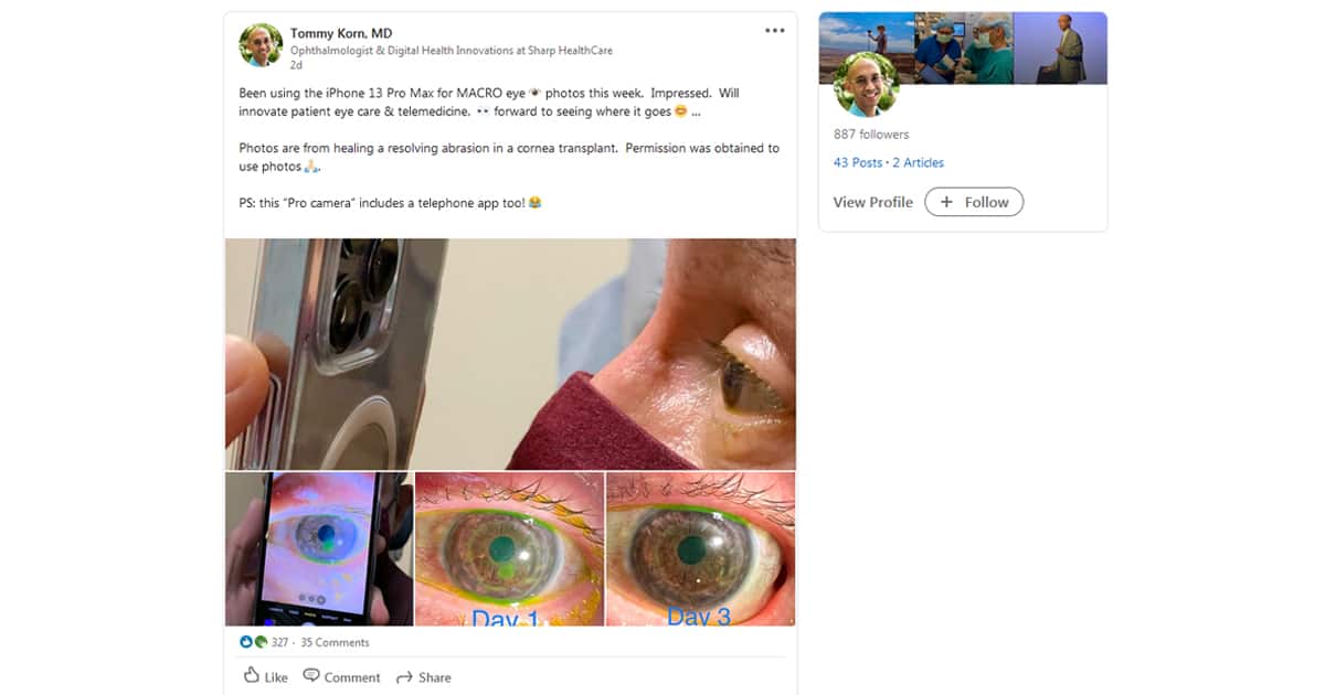 มีรายงานว่า Tommy Korn คุณหมอจักษุแพทย์ ได้ค้นพบการใช้งานโหมดถ่ายภาพด้วย กล้องมาโคร iPhone 13 Pro Max โดยคุณหมอได้แชร์รายละเอียดผ่านโพสต์บน LinkedIn ว่า เขาใช้ iPhone 13 Pro Max เป็นเครื่องมือเพื่อตรวจสอบดวงตาของผู้ป่วย ด้วยโหมดถ่ายมาโครระยะใกล้