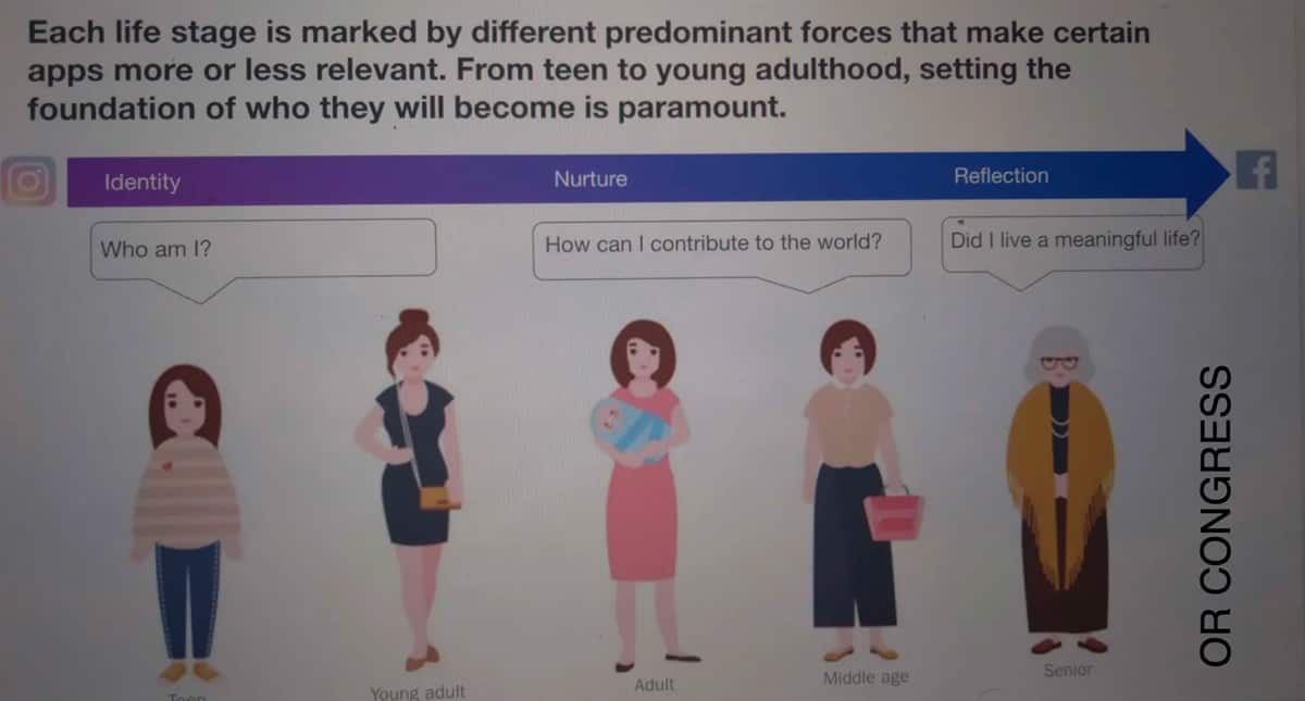 ในอีกสไลด์หนึ่ง อธิบายเกี่ยวกับการจัดการช่องว่างการมีส่วนร่วมที่มีอยู่ระหว่างผู้ใช้ที่มีอายุน้อยกับผู้ใช้สูงอายุ ในรายงานระบุเอาไว้ว่าผู้ใช้ที่มีอายุมากกว่า 30 ปีในสหรัฐฯใช้เวลาบน Facebook เฉลี่ย 24 นาทีต่อวัน ซึ่งเป็นค่าเฉลี่ยที่สูงกว่าผู้ใช้ที่มีอายุน้อย