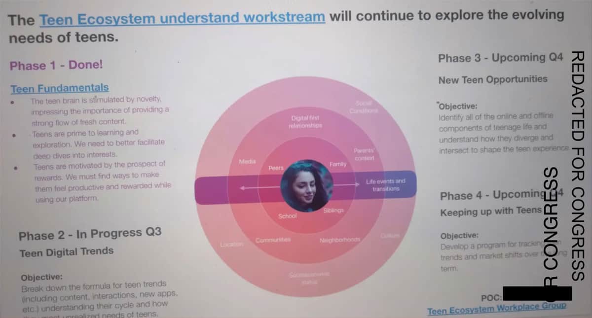 ในพรีเซนเทชั่นเมื่อเดือนมีนาคม 2021 ต่อ Chris Cox ผู้บริหารฝ่ายผลิตภัณฑ์ของ Facebook แสดงให้เห็นว่าการลงทะเบียนบัญชีผู้ใช้ที่อายุต่ำกว่า 18 ปีลดลงถึง 26% เมื่อเทียบกับปีที่แล้วใน 5 ประเทศชั้นนำ มีจุดสังเกตคือ บริษัทมองเห็นว่าระดับความมีส่วนร่วมของกลุ่มผู้ใช้ที่เป็นวัยรุ่นนั้นต่ำกว่าและค่อยๆ ลดลงเมื่อเทียบกับกลุ่มผู้ใช้ที่มีอายุสูงกว่า รวมถึงข้อความที่วัยรุ่นส่งถึงกันผ่าน Messenger ลดลงถึง 16% จากปีที่แล้ว