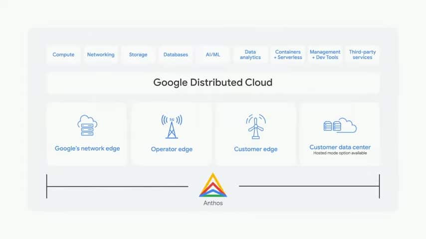 เพื่อช่วยให้องค์กรต่างๆ เพิ่มขีดความสามารถในการปรับใช้ระบบคลาวด์ได้ทุกที่ Google ได้เปิดตัว Google Distributed Cloud กลุ่มผลิตภัณฑ์ฮาร์ดแวร์และซอฟต์แวร์ที่มีการจัดการเต็มรูปแบบ ซึ่งขยายโครงสร้างพื้นฐานและบริการของ Google Cloud ไปยังจุดเชื่อมต่อคลาวด์และศูนย์ข้อมูล
