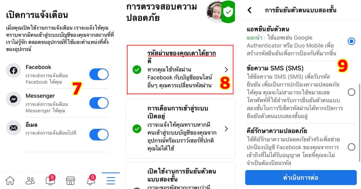 7. ให้เลือกทีละหัวข้อที่ขึ้นในหน้า โดยเริ่มจาก เปิดใช้งานการแจ้งเตือนการเข้าสู่ระบบ โดยผู้ใช้ต้องเข้าไปเปิดการแจ้งเตือนเมื่อมีผู้เข้าสู่ระบบผ่าน Facebook , Messenger และ อีเมล เมื่อทำทั้งหมดแล้วระบบจะมีเครื่องหมายติ๊กถูก