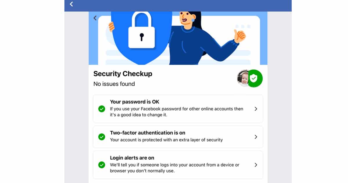 เมื่อทำทุกอย่างครบตามที่ระบบต้องการ ทุกหัวข้อ จะมีสัญลักษณ์ติ๊กถูกสีเขียวขึ้นทั้งหมด นั่นหมายความว่า ผู้ใช้ได้ทำการเปิดใช้ Facebook Protect เสร็จเรียบร้อยแล้ว