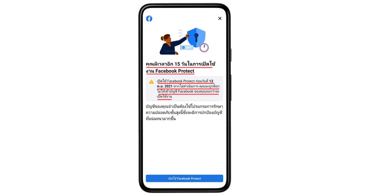 ทีมงานล้ำหน้าฯ วันนี้เราจะมาแนะนำ วิธีเปิดใช้ Facebook Protect หลังจากที่หลายคนได้รับการแจ้งเตือน (กึ่งบังคับ) ระบุว่า ” คุณมีเวลา 15 วันในการเปิดใช้งาน Facebook Protect เปิดใช้ Facebook Protect ก่อนวันที่ 12 พ.ย. 2021 หากไม่ดำเนินการ คุณจะถูกล็อกไม่ให้เข้าบัญชี Facebook ของคุณจนกว่าจะเปิดใช้งาน “