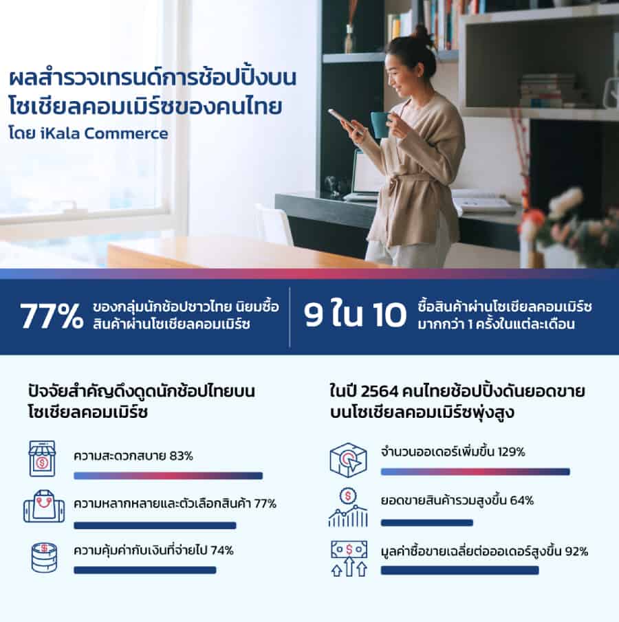 รายงานผลสำรวจล่าสุดจาก iKala Commerce ผู้นำด้านการให้บริการโซลูชั่นเทคโนโลยี AI เพื่อธุรกิจโซเชียลคอมเมิร์ซ แบบครบวงจรให้แก่ธุรกิจในประเทศไทยและประเทศในเอเชียตะวันออกเฉียงใต้ เผยว่า กลุ่มนักช้อปชาวไทยนิยมซื้อสินค้าบนแพลตฟอร์มโซเชียลมีเดียเพิ่มขึ้นอย่างต่อเนื่อง ด้วยปัจจัยด้านความสะดวกสบาย (83%) ความหลากหลายและตัวเลือกสินค้า (77%) และราคา (74%) โดยในปี 2564 จำนวนออเดอร์บนโซเชียลคอมเมิร์ซที่มาจากกลุ่มนักช้อปชาวไทยเพิ่มสูงขึ้นกว่า 129%