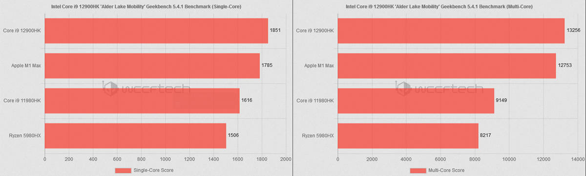 โปรเซสเซอร์ Intel Core i9-12900HK ทำคะแนนได้เหนือกว่าคู่แข่งด้วยการใช้พลังงานประมวลผลที่สูงขึ้น และเทคโนโลยีการผลิตขั้นสูงกว่า อย่างไรก็ตาม ผลคะแนนของ Geekbench นั้นไม่ได้เป็นตัวชี้วัดที่สามารถชี้ขาดประสิทธิภาพการทำงานโดยรวมของโปรเซสเซอร์ได้อย่างชัดเจน มีอีกหลายปัจจัยที่ใช้ประกอบการพิจารณาด้วย