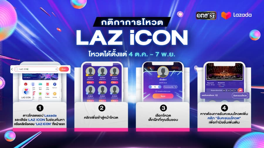 - นอกจากนี้ แฟนๆ สามารถเพิ่มคะแนนโหวตได้ เพียงเข้าหน้า LAZ iCON รับ 2 โหวต และรับชมไลฟ์ผ่าน LazLive รายการใดก็ได้รับ 5 โหวตอีกด้วย