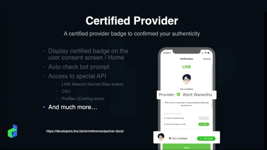 โอกาสในการสร้างความน่าเชื่อถือให้กับบริษัทนักพัฒนา ด้วย badge รับรองสู่สายตาผู้ใช้เวลาใช้งานบริการต่างๆ ขององค์กร พร้อมฟีเจอร์ Auto Check Bot ให้โดยอัตโนมัติเวลาผู้ใช้เข้าสู่หน้า User Consent เมื่อเริ่มใช้งาน Chatbot ขององค์กร และที่น่าสนใจคือ สิทธิ์ในการเข้าถึง API ชุดพิเศษ ที่มีหลากหลายฟังก์ชั่นมาอำนวยความสะดวกให้นักพัฒนาทำงานง่ายขึ้น อาทิ LINE Beacon Banner / Stay Events แบนเนอร์โฆษณาบนหน้าแอปฯ LINE เมื่อผู้ใช้เข้าใกล้รัศมีของ Beacon และสัญญาณ Stay ที่แจ้งให้เซิร์ฟเวอร์ทราบว่าผู้ใช้งานท่านใดยังอยู่ในรัศมีทำการ CAU (Custom Aggregation Unit) ฟังก์ชั่นช่วยให้นักพัฒนาสามารถเก็บ Data insight อาทิ จำนวนคนที่เปิดข้อความ หรือคลิกข้อความ และ Profile+ ระบบใหม่ที่ช่วยให้เข้าถึงข้อมูลผู้ใช้ได้มากยิ่งขึ้น อาทิ ชื่อ นามสกุล เพศ ที่อยู่ เบอร์ติดต่อ เป็นต้น ซึ่งต้องได้รับอนุญาตจากผู้ใช้งานก่อน โดยระบบจะเปิดตัวให้ใช้บริการในเร็วๆ นี้