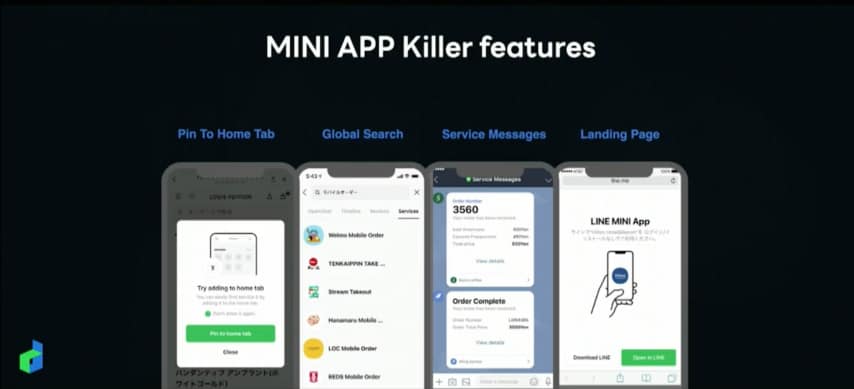 ตามมาด้วย LINE MINI APP ช่องทางในการสร้างแอปฯ ใน LINE ในรูปแบบ App-in-App ที่จะปรากฏอยู่ในแท็บ Home บน LINE ทำให้ผู้ใช้ไม่ต้องคอยสลับแอปฯ ไปมาระหว่างการเข้าใช้งาน พร้อมเพิ่มช่องทางที่ให้ผู้ใช้งานเข้าถึงบริการของคุณได้ง่ายขึ้น ด้วยฟีเจอร์ไม่ธรรมดาของ LINE MINI APP ได้แก่