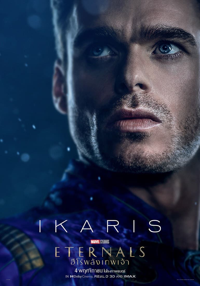 อิคาริส Ikaris (รับบทโดย ริชาร์ด แมดเดน) ฮีโร่นักสู้ ผู้ทรงพลังและแข็งแกร่ง เขาเป็นทหารผู้ภักดี จริงจังและมุ่งมั่นต่อความรับผิดชอบในฐานะ Eternals อิคาริสมีความสามารถในการบิน และปล่อยลำแสงอันทรงพลังออกจากดวงตาของเขาได้