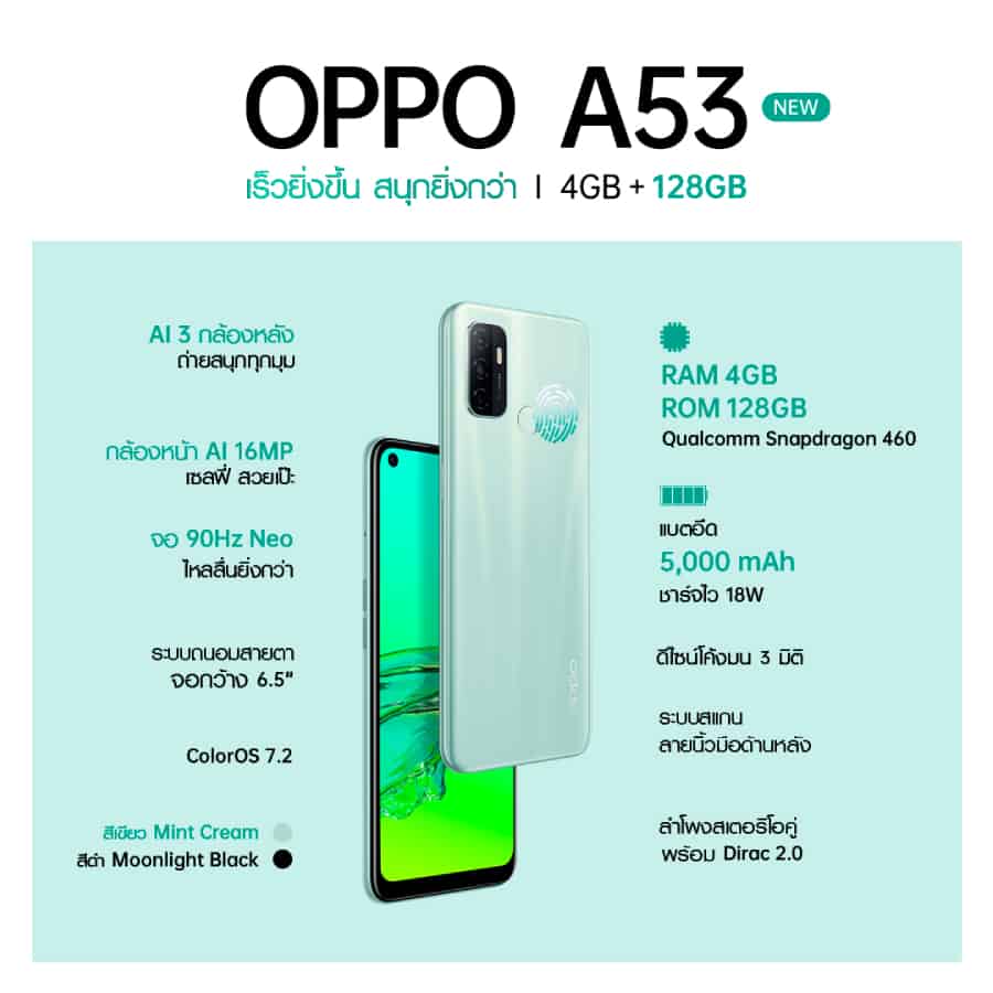 พบกับความเร็วแรงที่มากขึ้นและสนุกได้มากกว่าที่เคยกับ OPPO A53 NEW รุ่น RAM 4GB, ROM 128GB ใหม่ ได้ตั้งแต่วันที่ 22 ตุลาคม 2564 โดยมี 2 สีสันสดใสให้เลือก คือ สีเขียว Mint Cream และสีดำ Moonlight Black มาในราคาเพียง 6,499 บาท ที่ OPPO Brand Shop ทุกสาขา และตัวแทนจำหน่ายทั่วประเทศ