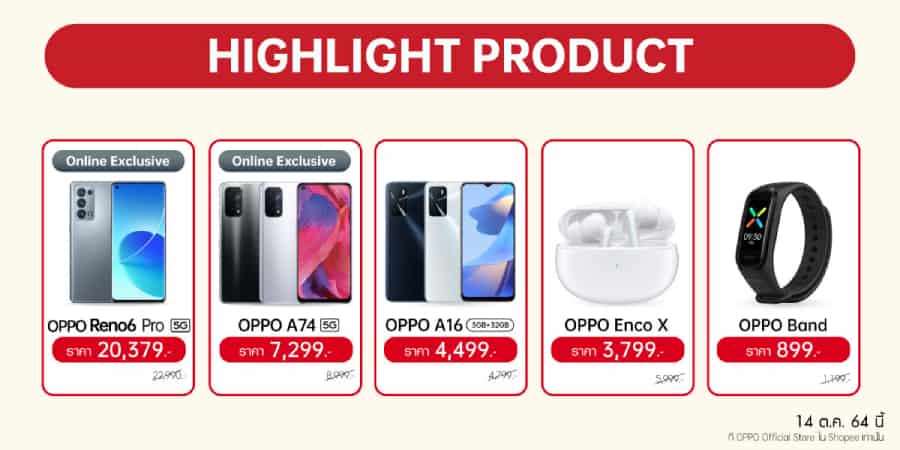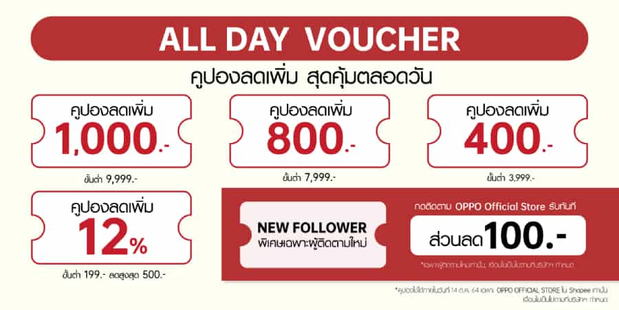 - Follow us! Voucher คูปองพิเศษเมื่อติดตาม OPPO Official Store ในวันที่ 14 ตุลาคม 2564 รับฟรี! คูปองส่วนลด 100 บาท เมื่อซื้อขั้นต่ำ 799 บาท โดยสามารถใช้คูปองได้ในวันที่ 14 ตุลาคม 2564 เท่านั้น
