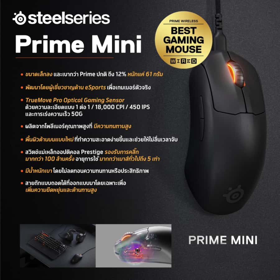 สำหรับ Prime Mini เป็นเมาส์ที่มีขนาดเล็กและโดดเด่นเรื่องความเบา โดยมีน้ำหนักเพียง 61 กรัมเท่านั้น ทั้งยังมาพร้อมนวัตกรรมสวิทซ์แบบ Prestige OM ที่ใช้เทคโนโลยีแม่เหล็ก และลำแสงอินฟาเรด เพื่อให้ตอบสนองการเล่นได้อย่างรวดเร็ว แม่นยำ ทั้งยังทนทานกว่าเมาส์ทั่วไปถึง 5 เท่า โดยรองรับการคลิกได้มากถึง 100 ล้านครั้ง นอกจากนี้ยังมีเซ็นเซอร์คุณภาพสูง TrueMove Pro ที่สามารถใช้งานได้ทุกสภาพพื้นผิว รับรู้การโยกเอียง (Tilt Tracking) ของเมาส์ได้ ทำให้เกมเมอร์ควบคุมการเล่นได้อย่างแม่นยำในทุกอริยาบท แถมยังปรับตั้งค่าเบื้องต้นบนตัวเมาส์ได้โดยไม่ได้ต้องเชื่อมกับซอฟท์แวร์ มีการติดตามแบบ 1 ต่อ 1 ความละเอียด 18,000 CPI ความเร็ว 450 IPS และอัตราเร่ง 50G ยิ่งไปกว่านั้น พื้นของเมาส์ยังทำจากวัสดุอย่างดี PTFE เกรด Virgin ทำให้นุ่มและช่วยลดแรงเสียดทานได้เป็นอย่างดี โดยวางจำหน่ายในราคา 2,690 บาท