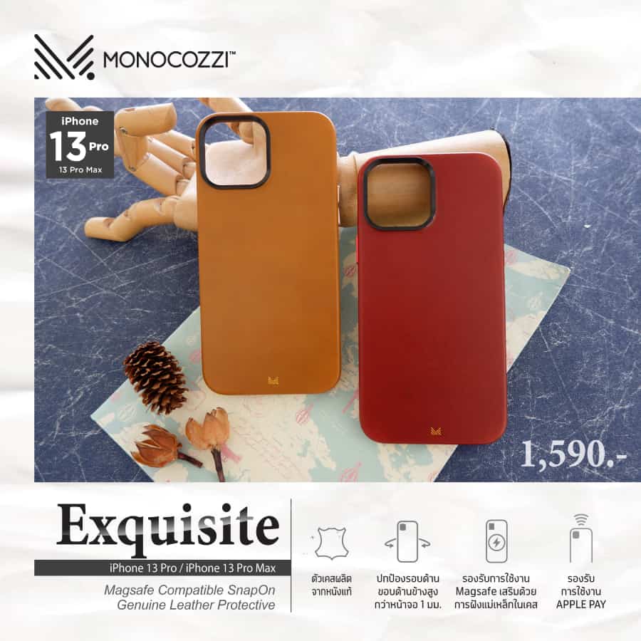 นอกจากนี้ยังมีเคสรุ่น EXQUISITE Magsafe Compatible SnapOn Genuine Leather Protective Case เป็นเคสที่ได้รับการออกแบบมาเป็นพิเศษ ตัวเคสผลิตจากหนังแท้ สามารถช่วยป้องกันแรงกระแทกรอบด้านได้อย่างนุ่มนวล ทั้งยังรองรับการใช้งาน Magsafe ชาร์จแบบไร้สายสำหรับ iPhone 13 ที่เสริมด้วยการฝังแม่เหล็กไว้ในเคส เมื่อใส่เคสเข้ากับ iPhone 13 โดยเคสรุ่น EXQUISITE Magsafe Compatible SnapOn Genuine Leather Protective Case สามารถรองรับ iPhone 13 Pro และ iPhone 13 Pro Max วางจำหน่ายแล้ววันนี้ในราคา 1,590 บาท
