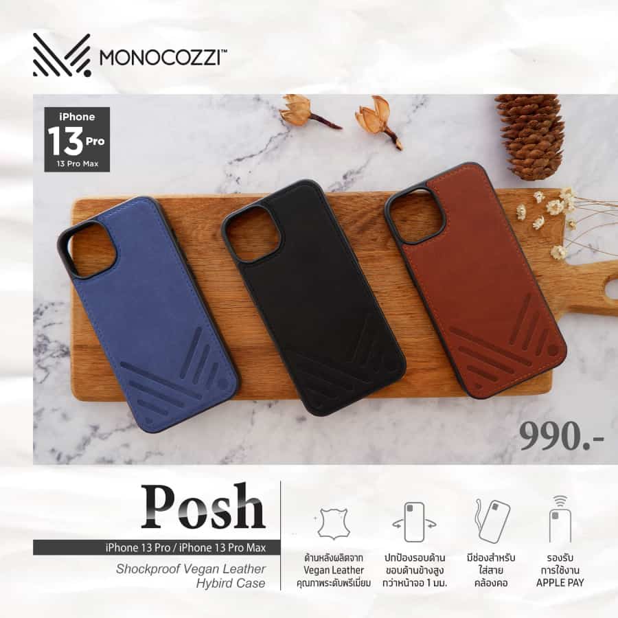 ในส่วนเคสรุ่น POSH Shockproof Vegan Leather Hybrid Case เป็นเคสคุณภาพระดับพรีเมี่ยมที่ด้านหลังผลิตจาก Vegan Leather หนังคุณภาพดีที่เป็นมิตรต่อสิ่งแวดล้อม ซึ่งมาพร้อม Bumper TPU แบบ Hybrid ที่จะช่วยป้องกันแรงกระแทกและป้องกันฝุ่นได้อย่างยอดเยี่ยม โดยเคสรุ่น POSH Shockproof Vegan Leather Hybrid Case สามารถรองรับ iPhone 13, iPhone 13 Pro และ iPhone 13 Pro Max วางจำหน่ายแล้ววันนี้ในราคา 990 บาท