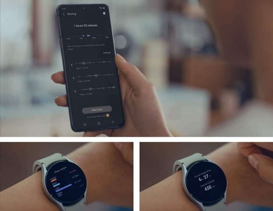 หลังจากใช้เวลาทั้งวันไปกับกิจกรรมต่างๆ ในยามที่หลับตาลง Galaxy Watch4 Series ก็ยังเป็นเพื่อนคนสุดท้ายที่คอยเฝ้าคุณระหว่างหลับใหล ไม่ได้หยุดการทำงานแต่อย่างใด เพื่อให้มั่นใจได้ว่าคุณจะสามารถรับรู้ประสิทธิภาพการนอนของตนเองได้อย่างเต็มที่ ไม่ว่าจะเป็นการมอนิเตอร์ภาวะการนอนหลับและการนอนกรน ที่นอกจากจะมีผลกระทบต่อคนรอบข้างแล้ว ยังอาจทำให้ตื่นมาไม่สดชื่น รู้สึกนอนไม่เต็มอิ่ม ส่งผลให้เรียนหรือทำงานได้ไม่เต็มที่ และอาจส่งผลไปสู่โรคอื่นๆ ได้อีกมากมาย ไปจนถึงการมอนิเตอร์ภาวะการหยุดหายใจระหว่างหลับ ผ่านการใช้งานร่วมกับสมาร์ทโฟนที่รองรับการตรวจจับเสียงกรน นอกจากนี้ ยังสามารถวัดค่าออกซิเจนในเลือด (SpO2) รวมถึงประเมินคะแนนคุณภาพการนอนหลับ (Sleep Scores) เพื่อให้สามารถปรับพฤติกรรมการนอนของตนเองและพักผ่อนได้อย่างเต็มอิ่ม พร้อมก้าวเข้าสู่วันใหม่อย่างสุขภาพดีได้ทุกวัน
