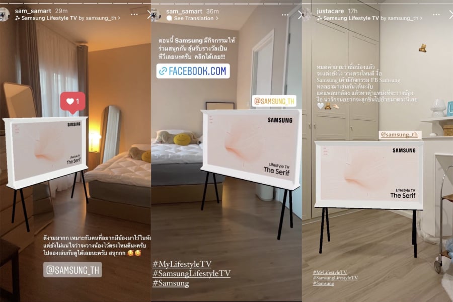 Samsung “เติมเต็มไลฟ์สไตล์ สุขได้ที่บ้านคุณ” ชวนออกแบบมุมโปรดโดยการยกไลฟ์สไตล์ทีวีมาไว้ถึงบ้านผ่านฟิลเตอร์ Instagram Story สุดครีเอท ให้คุณสนุกกับการสร้างสรรค์มุมใหม่ๆ ของบ้านในรูปแบบเสมือนจริงด้วยไลน์อัพทีวีที่มีดีไซน์อันโดดเด่นและหลากหลาย เพื่อตอบรับไลฟ์สไตล์ของผู้ใช้ที่ต่างกัน นำโดย Samsung The Frame, The Serif, The Premiere, The Sero และ The Terrace ซึ่งล้วนผสานที่สุดแห่งดีไซน์เข้ากับเทคโนโลยีอย่างไร้ที่ติ เติมเต็มสไตล์และลงตัวกับทุกพื้นที่ในบ้านอย่างสมบูรณ์แบบ