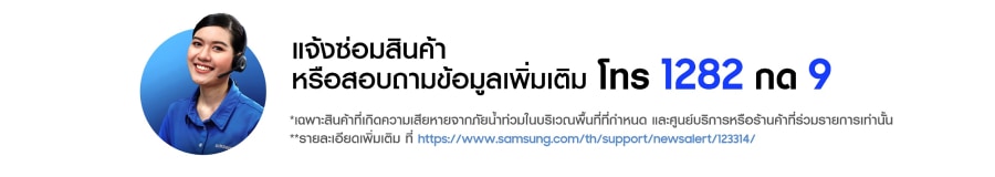 ลูกค้าที่ประสงค์ขอรับบริการ สามารถแจ้งซ่อมและสอบถามข้อมูลเพิ่มเติมได้ที่ศูนย์บริการลูกค้าสัมพันธ์ โทร. 1282 กด 9 หรือไลฟ์แชท ทุกวันตลอด 24 ชั่วโมง ผ่านช่องทาง www.samsung.com/th/support หรือดาวน์โหลดแอปพลิเคชั่น Samsung Members ลงชื่อเข้าใช้งานและเลือก แชทผ่านข้อความ หรือนำสินค้าที่ได้รับความเสียหายไปยังจุดรับเครื่องซ่อมเฉพาะกิจ 5 แห่ง ได้แก่