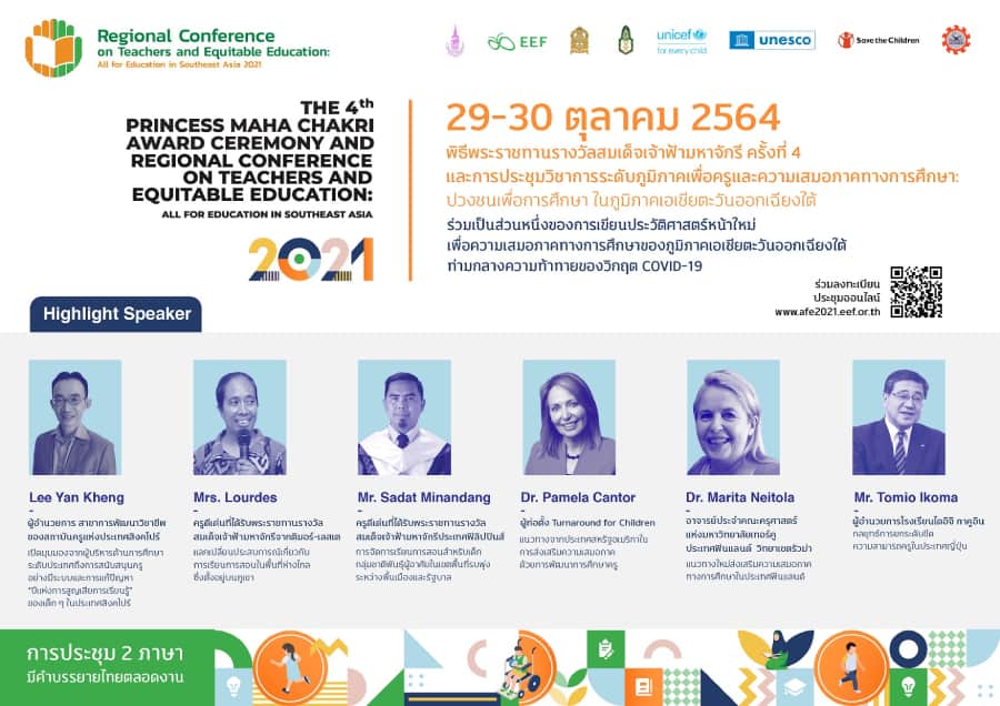 นอกจากนั้นยังมีนักวิชาการและผู้ร่วมประชุมชื่อดังจากองค์กรชั้นนำทั่วโลกเข้าร่วมอภิปรายในหัวข้อต่างๆ อีกมากมาย ผู้ที่สนใจร่วมเป็นส่วนหนึ่งของการเขียนประวัติศาสตร์หน้าใหม่ของการศึกษาโลก ท่ามกลางความท้าทายของวิกฤตโควิด-19 ในพิธีพระราชทานรางวัลสมเด็จเจ้าฟ้ามหาจักรี ครั้งที่ 4 ปี 2564 และเวทีวิชาการระดับภูมิภาค “การประชุมวิชาการระดับภูมิภาคเพื่อความเสมอภาคทางการศึกษาและครู: ปวงชนเพื่อการศึกษาในภูมิภาคเอเชียตะวันออกเฉียงใต้” วันศุกร์ที่ 29 ตุลาคม 2564 เวลา 08.30 – 16.30 น. และวันเสาร์ที่ 30 ตุลาคม 2564 เวลา 9.00 – 16.30 น. สามารถลงทะเบียนผ่านเว็บไซต์ www.afe.eef.or.th
