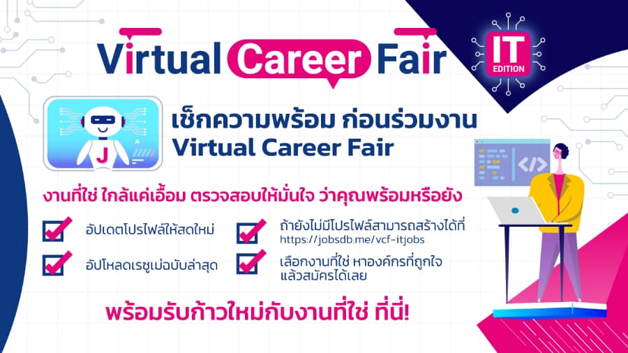 ผู้ที่สนใจสามารถลงทะเบียนร่วมงาน “Virtual Career Fair by JobsDB (IT Edition)” ได้แล้วที่ http://jobsdb.me/VCF2-itjobs งานเริ่มตั้งแต่วันที่ 6 – 8 ตุลาคม 2564