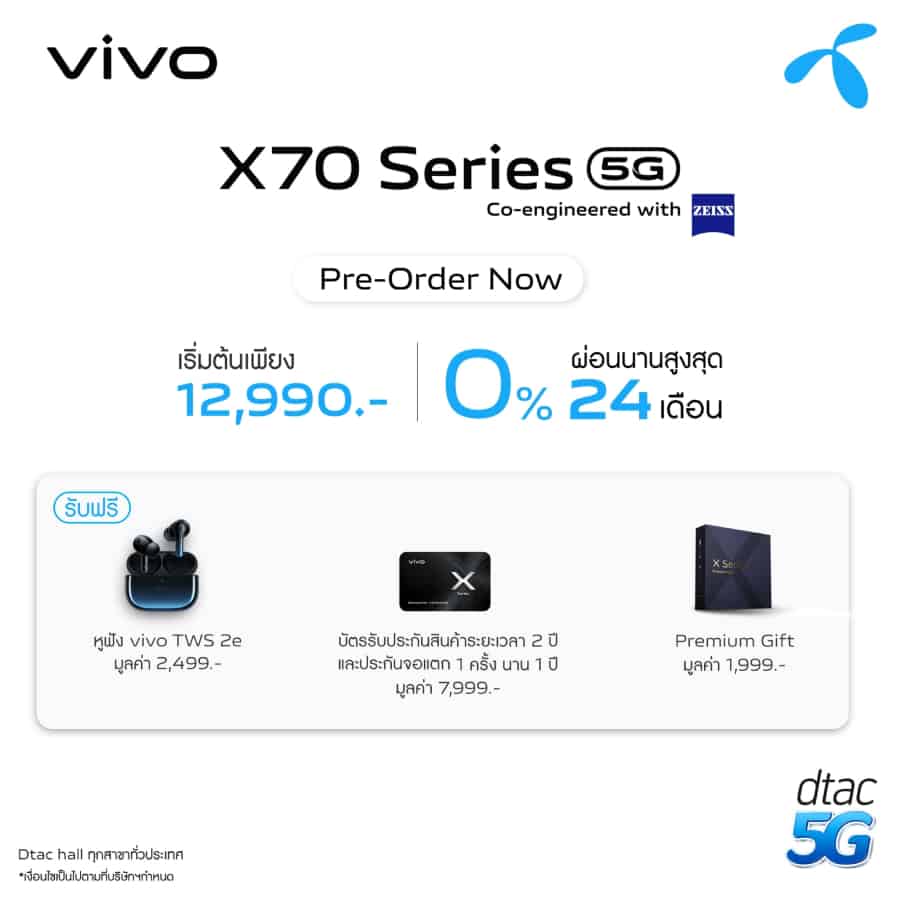 และโปรโมชันพิเศษจาก Dtac ผู้ใช้งานสามารถเป็นเจ้าของ vivo X70 Series 5G ได้ในราคาเริ่มต้นเพียง 12,990 บาท พร้อมรับสิทธิในการผ่อนชำระ 0% นานสูงสุดถึง 24 เดือน สั่งจองวันนี้รับฟรีทันที หูฟัง vivo TWS 2e มูลค่า 2,499 บาท บัตรรับประกันสินค้าระยะเวลา 2 ปี และประกันจอแตก 1 ครั้ง นาน 1 ปี มูลค่า 7,999 บาท พร้อมของแถม Premium Gift มูลค่า 1,999 บาท ที่ร้าน Dtac hall ทุกสาขาทั่วประเทศ ติดตามรายละเอียดโปรโมชัน และเงื่อนไขอื่นๆ เพิ่มเติมได้ที่ https://www.dtac.co.th/s/g2e2X1a
