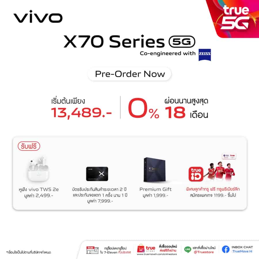 อีกหนึ่งโปรโมชันพิเศษที่ไม่ควรพลาดจาก TrueMove H สามารถเป็นเจ้าของ vivo X70 Series 5G ได้แล้ววันนี้ ที่ราคาเริ่มต้น 13,489 บาท ผ่อน 0% นานสูงสุด 18 เดือน พร้อมรับฟรีทันที หูฟัง vivo TWS 2e มูลค่า 2,499 บาท บัตรรับประกันสินค้าระยะเวลา 2 ปี และประกันจอแตก 1 ครั้ง นาน 1 ปี มูลค่า 7,999 บาท พร้อมของแถม Premium Gift มูลค่า 1,999 บาท พิเศษสำหรับลูกค้าทรู รับฟรี ทรูพรีเมียร์ลีก เมื่อสมัครแพคเกจ 1,199 บาท ขึ้นไป สามารถสั่งจองได้แล้ววันนี้ที่ร้านทรูช็อป และทรูช็อปใน 7-Eleven ทั่วประเทศ รวมถึงช่องทางการสั่งซื้อออนไลน์ พร้อมบริการจัดส่งฟรีถึงบ้าน ติดตามรายละเอียดเพิ่มเติมได้ที่https://truemoveh.truecorp.co.th/device/detail/2443?bundle=package