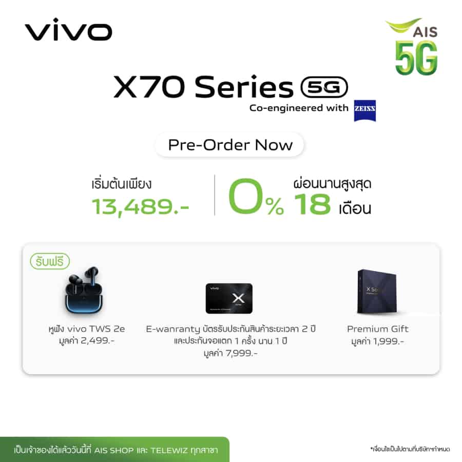 เป็นเจ้าของ vivo X70 Series 5G ได้ง่ายๆ กับทาง AIS ในราคาเริ่มต้นเพียง 13,489 บาท พร้อมโปรโมชันพิเศษ ผ่อน 0% นานสูงสุด 18 เดือน พร้อมรับฟรีทันที หูฟัง vivo TWS 2e มูลค่า 2,499 บาท บัตรรับประกันสินค้า (E-warranty) ระยะเวลา 2 ปี และประกันจอแตก 1 ครั้ง นาน 1 ปี มูลค่า 7,999 บาท พร้อมของแถม Premium Gift มูลค่า 1,999 บาท เป็นเจ้าของได้แล้ววันนี้ที่ AIS Shop และร้าน Telewiz ทุกสาขา หรือสามารถติดตามรายละเอียด