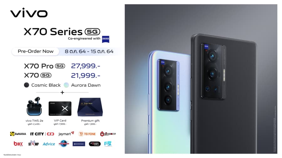 vivo X70 Pro 5G รุ่น RAM 12GB ความจุ 256GB เปิดให้สั่งจองได้ ที่ ราคา 27,999 บาท และ vivo X70 5G รุ่น RAM 8GB ความจุ 128GB ที่ราคา 21,999 บาท พิเศษ! สั่งจองวันนี้รับทันทีหูฟัง vivo TWS 2e มูลค่า 2,499 บาท พร้อม VIP Card ประกันเครื่องและหน้าจอ มูลค่า 7,999 บาท และ Premium gift มูลค่า 1,999 บาท ที่ร้าน vivo Brand Shop ทุกสาขา รวมทั้งตัวแทนจำหน่ายทั่วประเทศ ไม่ว่าจะเป็น BaNANA, IT City | CSC, Jaymart, TG FONE, KINGKONG, BKK, Stamp, Advice, แม่วังสื่อสาร, BOONCHAI, Power Mall และ PTE ทุกสาขาทั่วประเทศ