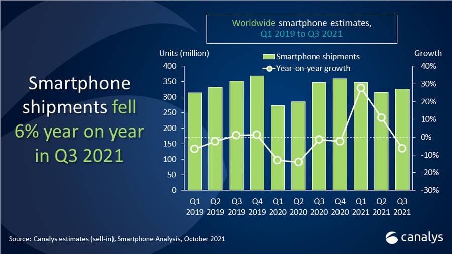 ปัญหาการขาดแคลนชิปเซ็ตทั่วโลก ทำให้ยอดจัดส่งสมาร์ทโฟนลดลง 6% ในไตรมาสที่ 3 ปี 2021 โดย Samsung ยังคงครองอันดับ 1 ในตลาด ตามมาด้วย Apple ในอันดับที่ 2 และ Xiaomi ในอันดับที่ 3