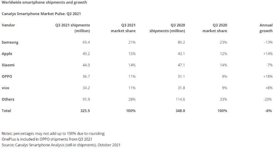 Samsung ครองตลาดด้วยยอดจัดส่ง 69.4 ล้านเครื่องและมีส่วนแบ่งตลาดอยู่ที่ 21% ส่วน Apple สามารถกลับขึ้นมาครองอันดับ 2 ได้อีกครั้ง ต้องขอบคุณยอดขายของ iPhone 13 ที่ทำให้บริษัทมียอดจำหน่ายสมาร์ทโฟน 49.2 ล้านเครื่อง และเติบโตขึ้น 14%