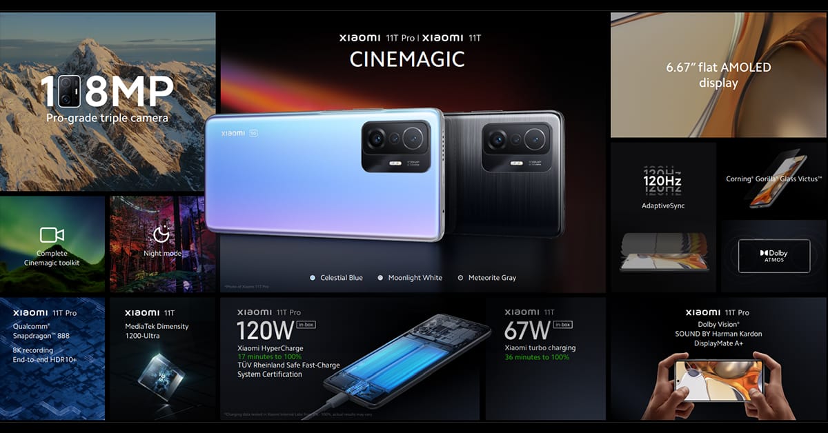 Xiaomi 11T Pro และ Xiaomi 11T ให้ประสบการณ์ความบันเทิงที่เหนือกว่าในทุกมิติภายใต้คอนเซ็ปต์ “Cinemagic” กับสมาร์ทโฟนระดับแฟล็กชิปที่มาพร้อมกับประสิทธิภาพอันเยี่ยมยอด Xiaomi 11T Pro มาพร้อมกับชิปเซ็ต Qualcomm Snapdragon 888 กล้องระดับเทพถึงสามตัวเทียบชั้นกล้องโปร ด้วยกล้องหลักเลนส์ไวด์ความละเอียด 108MP, เลนส์อัลตราไวด์ 120 องศา ความละเอียด 8MP, เลนส์ Telemacro ความละเอียด 5MP โหมด One-Click AI Cinema บันทึกภาพเคลื่อนไหวความละเอียดสูงถึง 8K และ HDR10+ และ Audio Zoom มีหน้าจอ AMOLED ความละเอียดระดับ FHD+ ขนาด 6.67 นิ้ว พร้อมทั้งรีเฟรชเรท 120Hz และผสานเทคโนโลยี TrueColor อีกด้วย