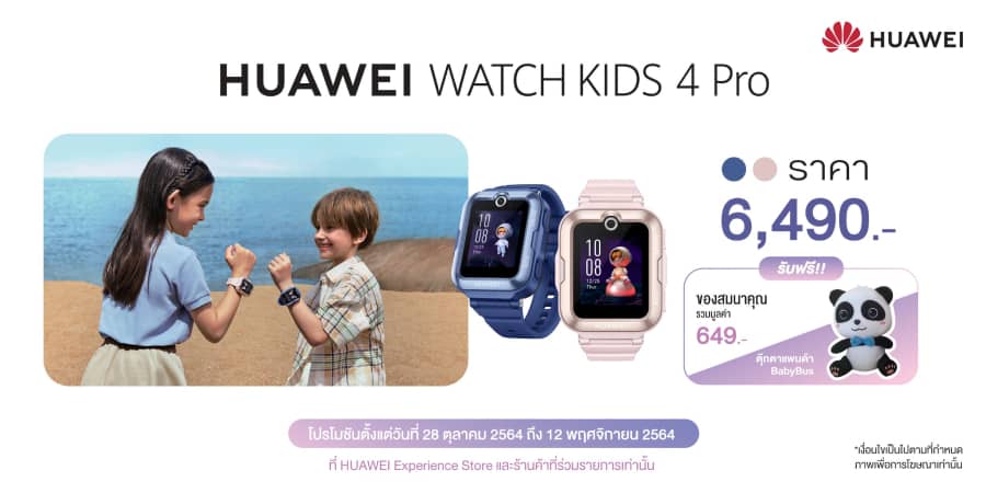 พิเศษ สำหรับใครที่สั่งซื้อ HUAWEI WATCH KIDS 4 Pro ตั้งแต่วันนี้ ถึง 12 พฤศจิกายน 2564 ผ่านช่องทางของ HUAWEI Experience Store จะมีได้รับของสมนาคุณเป็นตุ๊กตา BabyBus มูลค่า 649 บาท