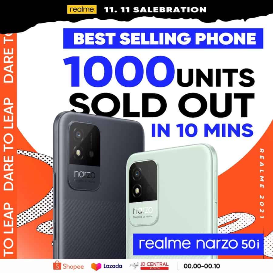 อีกหนึ่งรุ่นยอดนิยมเหมือนกัน คือ สมาร์ตโฟนรุ่นเริ่มต้นราคาสุดคุ้ม แต่อัดแน่นด้วยคุณภาพ กับ “realme narzo 50i” ที่สามารถขายได้ 1,000 เครื่อง ภายใน 10 นาทีเท่านั้น โดยความโดดเด่นของสมาร์ตโฟนรุ่นนี้ คือ การให้จอใหญ่สะใจถึง 6.5 นิ้ว และแบตเตอรี่ความจุมากถึง 5,000mAh รองรับการใช้งานทั่วไปได้ดีเยี่ยม โดยเฉพาะสายเสพคอนเทนต์ที่เน้นดูหนังฟังเพลงต่อเนื่องยาวนานตลอดวัน