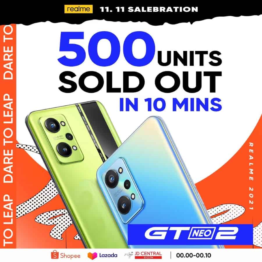 สำหรับสมาร์ตโฟนที่ขายดีสุด ต้องยกให้กับ Flagship Killer สมาร์ตโฟนเรือธงรุ่นใหม่ล่าสุด “realme GT Neo2 5G” ที่สามารถขายได้ 500 เครื่อง ภายใน 10 นาที โดยรุ่นนี้มาพร้อมกับซิปเซ็ตทรงพลัง Snapdragon 870 5G มอบประสิทธิภาพการทำงานขั้นสุด ลื่นไหลไม่มีสะดุดทุกฟีเจอร์ รองรับเกมกราฟิกหนัก ๆ ได้แบบสบาย ๆ พร้อมจอแสดงผล E4 AMOLED และรองรับระบบ SuperDart Charg เร็วสุด 65W สามารถใช้งานได้ตลอดวันและชาร์จได้รวดเร็วทันใจ และยังมอบดีไซน์หรูหราที่จะสะกดทุกสายตาด้วยโทนสีเขียวสดใส Neo Green