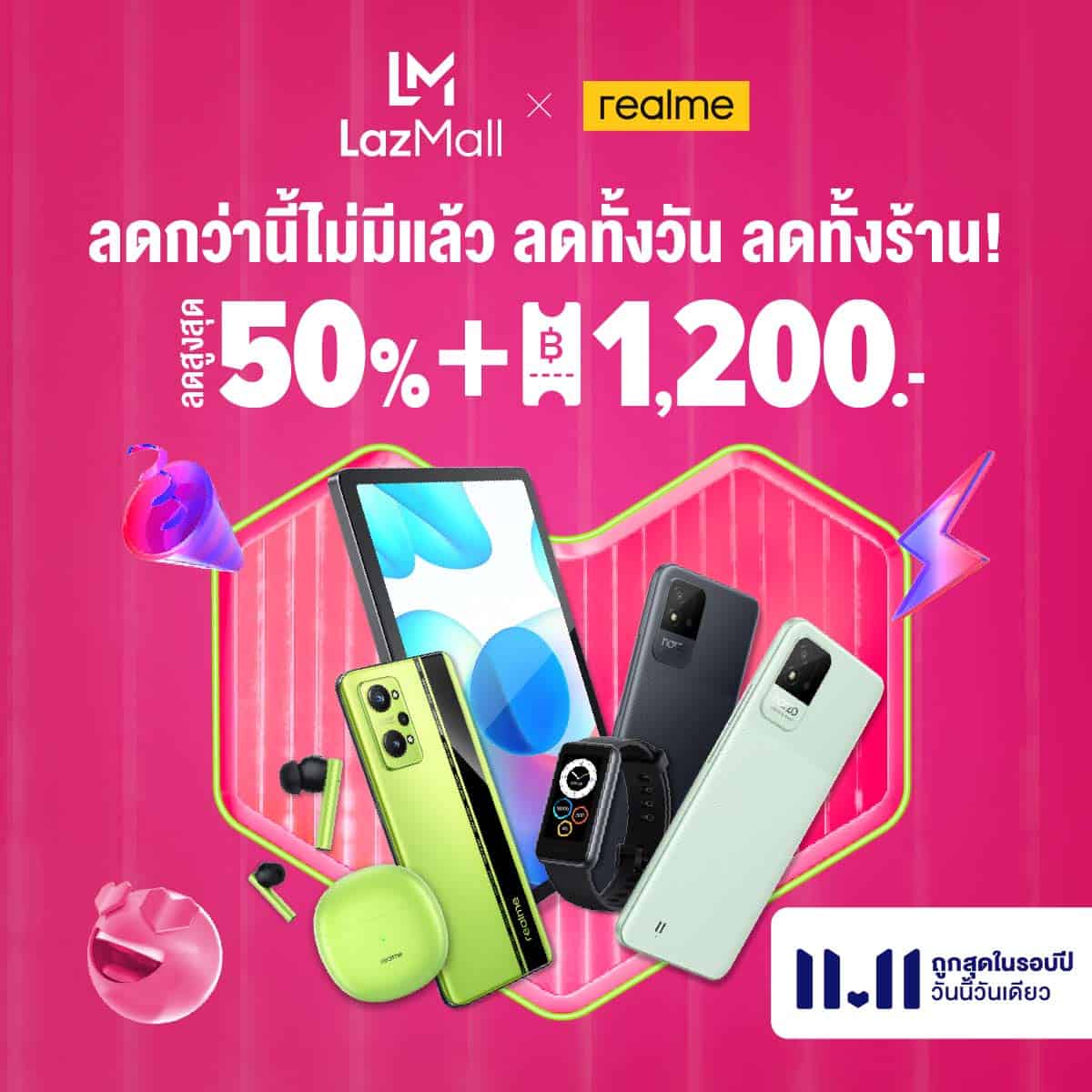realme ยกขบวนสินค้าสมาร์ตโฟนและ AIoT ลดกระหน่ำแบบจัดเต็มในแคมเปญ 11.11 realme MEGA SALES ลดสูงสุด 50% แถมโค้ดลดสูงสุด 1,200 บาท ในวันที่ 11 พฤศจิกายน 2564 เตรียมพบสินค้าสมาร์ตโฟนหลากหลายรุ่นและแกดเจ็ตสุดล้ำที่จะทำให้คุณได้สัมผัสกับ Smart Life ในราคาคุ้มค่าที่สุดแห่งปี