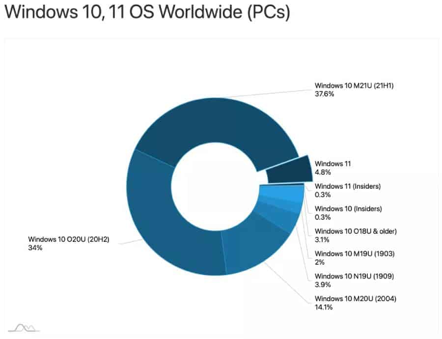 AdDuplex ได้ออกมาเผยผลสำรวจจากอุปกรณ์ 60,000 เครื่อง ว่ามีอุปกรณ์เครื่องไหนบ้างที่ใช้งาน Windows 10 หรือ 11? และพบว่ามีเพียง 5.1 เปอร์เซ็นต์ของผู้ใช้ PC ยุคใหม่ที่เปลี่ยนมาใช้ Windows 11 ส่วนผู้ใช้ 37.6 เปอร์เซ็นต์ยังคงใช้ Windows 10 M21U (21H1) และอีก 34 เปอร์เซ็นต์ ใช้ Windows 10 O20U (20H2)