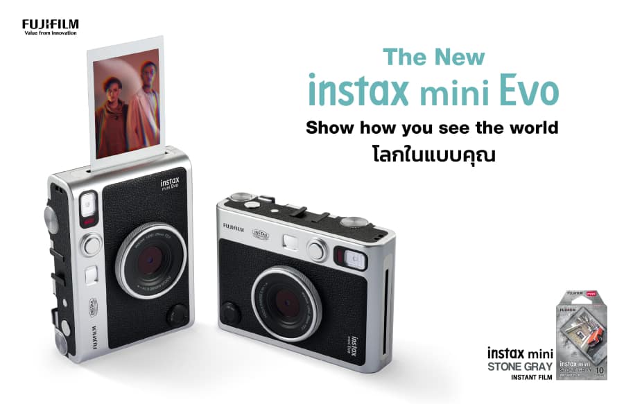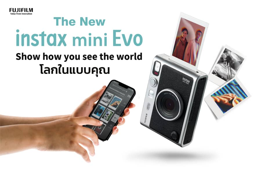 ฟูจิฟิล์ม (ประเทศไทย) เปิดตัวกล้อง instax รุ่นใหม่ล่าสุด instax mini Evo กล้องฟิล์มปริ้นได้ แบบ Hybrid Instant Camera ผสานความรู้สึกระหว่างการถ่ายฟิล์มอนาล็อกและดิจิทัลที่ลงตัว พร้อมฟีเจอร์ในรูปแบบของเลนส์ และฟิล์มเอฟเฟคถึง 100 รูปแบบ ด้วยคุณภาพการปริ้นรูปที่มีความละเอียดและคมชัดสูง ตัวกล้องสีดำซิลเวอร์ถูกออกแบบให้มีขนาดเล็ก สวยคลาสสิค เท่กับสไตล์ที่ลงตัว มาพร้อมคานเลื่อนฟิล์มด้านบนเสมือนกล้องฟิล์ม แต่ทำหน้าที่ในการสั่งปริ้นภาพแทน