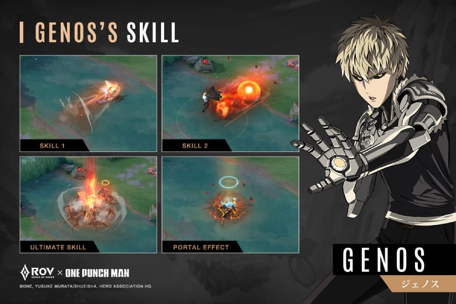 Genos จะมาในรูปแบบของสกิน Errol ซึ่งเป็นฮีโร่ยอดนิยมในเกม RoV มาพร้อมดีไซน์ที่ประณีต และเอฟเฟกต์สกิลสุดอลังการตามแบบอนิเมะ ซึ่งจะเห็นได้ชัดในเอฟเฟกต์ของสกิล 2 ที่ผู้เล่นจะได้สวมบทบาทเป็น Genos และฟาดฟันเหล่าศัตรูให้สิ้นซาก