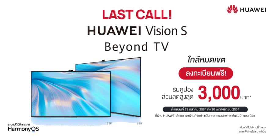 ความพิเศษยังไม่หมดเพียงเท่านั้น เพื่อเป็นการต้อนรับ Beyond TV เข้าสู่ตลาดประเทศไทยเป็นครั้งแรก หัวเว่ยจัดให้แบบไม่มีกั๊กสำหรับผู้ที่สนใจอยากจับจอง HUAWEI Vision S กับโอกาสสุดท้ายที่จะได้รับคูปองส่วนลดพิเศษมูลค่าสูงสุดถึง 3,000 บาท โดยสามารถลงทะเบียนรับคูปองได้ที่นี่ จนถึงวันที่ 30 พฤศจิกายน 2564 นี้เท่านั้น ส่วนใครที่กำลังรอคอยโปรโมชันเฉลิมฉลองการเผยโฉมอย่างเป็นทางการของ HUAWEI MateView GT 27” อดใจรออีกไม่นาน ในระหว่างนี้สามารถติดตามข่าวสารต่างๆ ได้ทาง เฟซบุ๊กเพจ Huawei Mobile TH และติดตามรายละเอียดเพิ่มเติมเกี่ยวกับผลิตภัณฑ์ได้ที่นี่ หรือผ่านช่องทางของตัวแทนจำหน่ายอย่างเป็นทางการทั้ง JD Central, Shopee และ Lazada