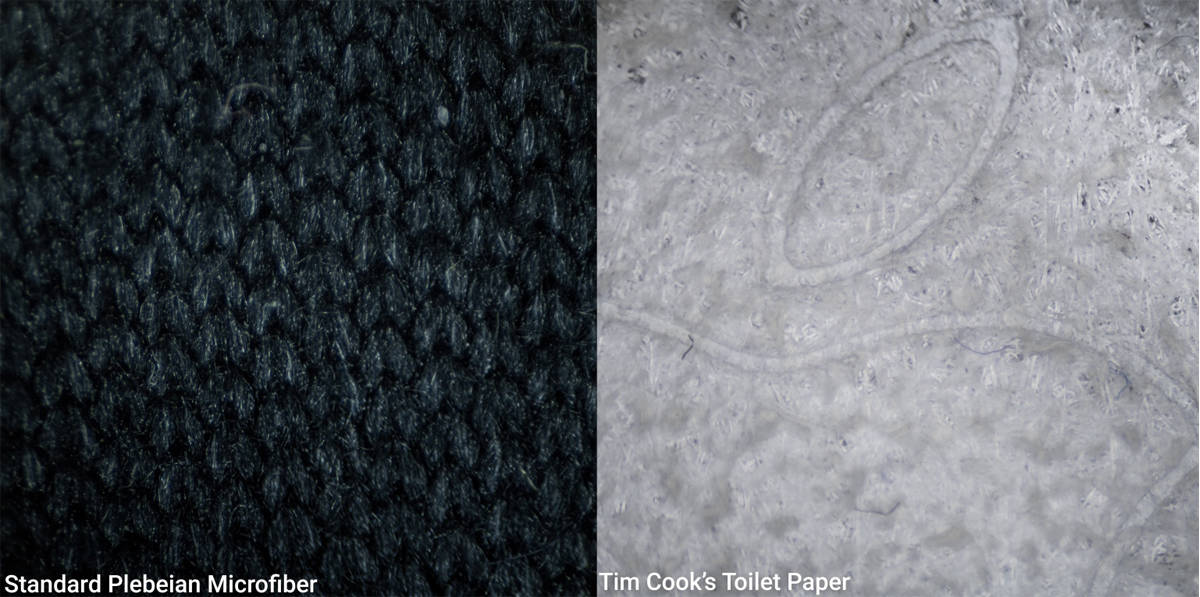 iFixit ไม่หยุดแต่เพียงเท่านั้น แต่ยังลงลึกไปอีกด้วยการใช้กล้องจุลทรรศน์ จากรูปซ้ายมือ นั่นคือผ้าเช็ดทำความสะอาดแบบเก่าธรรมดาๆ ส่วนขวามือคือ ผ้าเช็ดรอย Polishing Cloth ของ Apple (สังเกตได้จากบางส่วนของโลโก้ Apple)