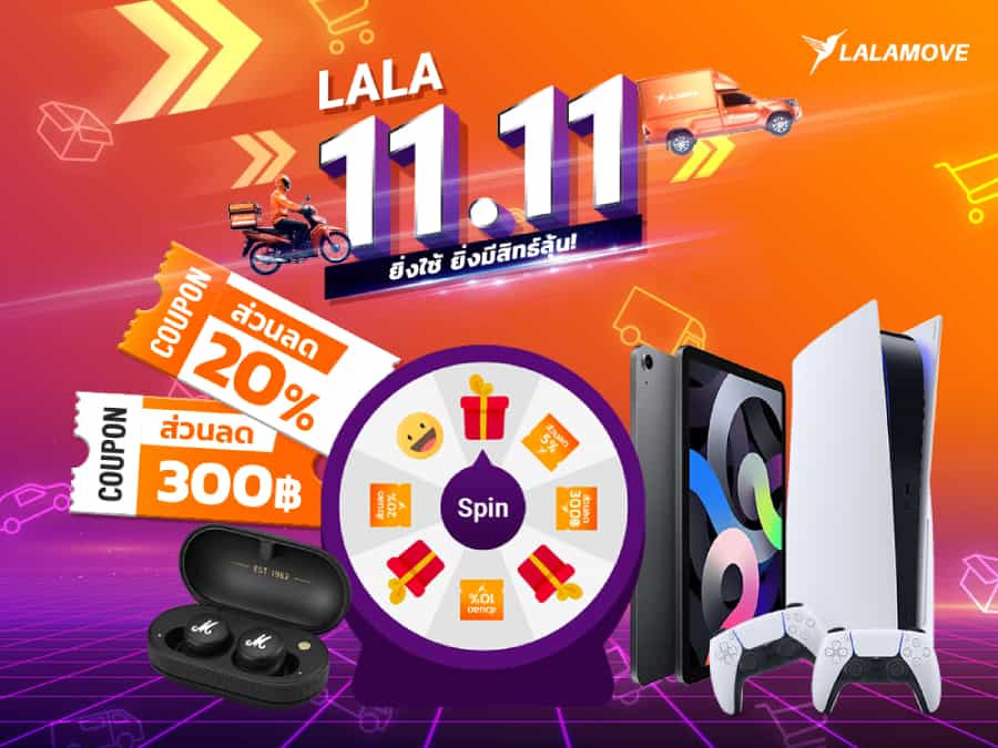 หมุนวงล้อ “LALA 11.11” สนุกรับทรัพย์ รับของสมนาคุณสุดพิเศษ ผ่านแอปพลิเคชัน LALAMOVE ตั้งแต่วันนี้ – 23 พฤศจิกายน ศกนี้ สำหรับลูกค้ารายใหม่ รับสิทธิ์หมุนวงล้อสูงสุด 12 ครั้งตลอดแคมเปญ และลูกค้าทั่วไปรับสิทธิ์หมุนวงล้อสูงสุด 10 ครั้งตลอดเเคมเปญ เพียงเรียกใช้บริการขนส่งทุก ๆ 2 งาน รับสิทธิ์หมุนวงล้อรับของสมนาคุณมากมาย อาทิ PlayStation5 (PS5), Apple iPad Mini6, Marshall Mode II หูฟังบลูทูธอินเอียร์ไร้สาย และคูปองส่วนลด มูลค่าสูงสุด 300 บาท