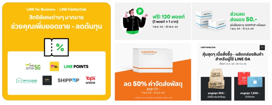 นอกจากนี้ ยังมีดีลพิเศษส่วนลดค่าบริการหลากหลายที่เกี่ยวข้องกับการทำธุรกิจ อาทิ ส่วนลดค่าขนส่ง ทั้งกับ LINE MAN และ KERRY ค่าอุปกรณ์กล่องพัสดุต่างๆ เป็นต้น ทำให้ผู้ประกอบการไม่เพียงเพิ่มยอดขายจากการใช้งาน LINE OA เท่านั้น แต่ยังสามารถลดค่าใช้จ่ายจากสิทธิประโยชน์ต่างๆ ไปด้วยในตัว