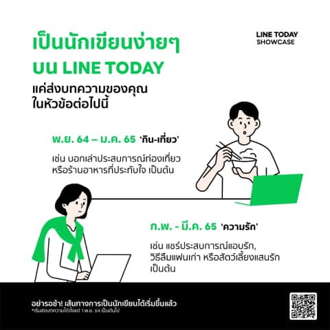 สนใจเข้าร่วมโครงการ LINE TODAY SHOWCASE สามารถลงทะเบียนสมัครและส่งบทความได้ที่ https://todayshowcase.line.me/ ตั้งแต่วันที่ 1 พฤศจิกายน พ.ศ. 2564 เป็นต้นไป