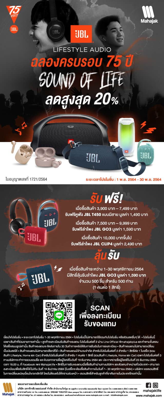 บริษัท มหาจักรดีเวลอปเมนท์ จำกัด โปรโมชั่น ฉลอง JBL 75th Anniversary สินค้า Lifestyle Audio ลดราคาสูงสุด 20% รับฟรี!! สินค้าหูฟังและลำโพง พร้อมรับสิทธิ์ลุ้นรับลำโพง JBL GO3 (มูลค่า 1,590.-) *เฉพาะสินค้าที่ร่วมรายการ