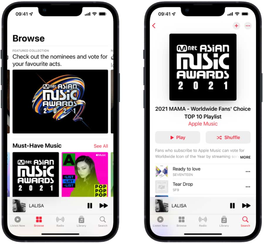 MAMA หรือ Mnet Asian Music Awards 2021 คือเวทีประกาศรางวัล K-Pop ที่ใหญ่ที่สุดแห่งปี ซึ่งความพิเศษของปีนี้คือแฟนๆ ทุกคนในกว่า 167 ประเทศจะสามารถสนับสนุนผลงานของศิลปินและกลุ่มที่ตัวเองชื่นชอบได้ด้วยการสตรีมเพลงผ่าน Apple Music เพื่อนำความนิยมทั่วโลกของ K-Pop มาเป็นส่วนหนึ่งของกระบวนการตัดสิน โดยมีเพลย์ลิสต์ “2021 MAMA – Worldwide Fans’ Choice TOP 10” บน Apple Music ที่จะเป็นตัวชี้วัดรางวัล “Fans’ Choice TOP 10” และ “Worldwide Icon Of The Year” ซึ่งจะประกาศรางวัลในงานแบบสดๆ ให้ทุกคนได้ชมกันด้วย