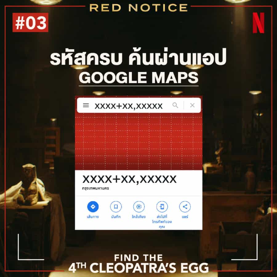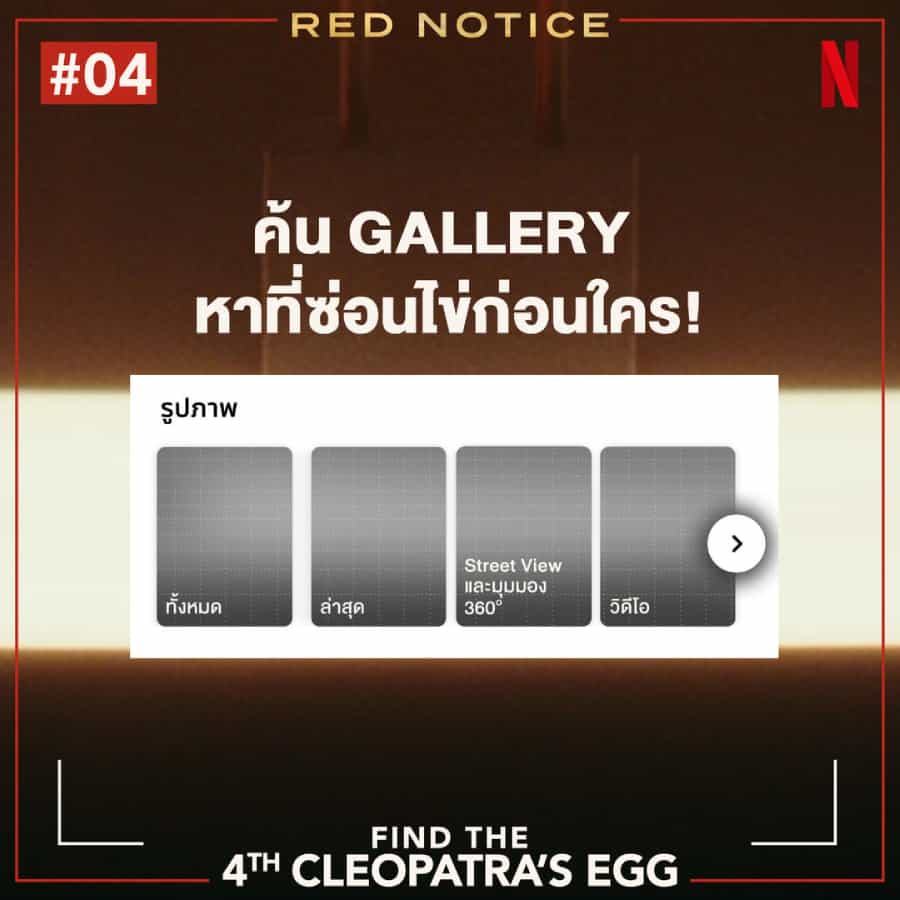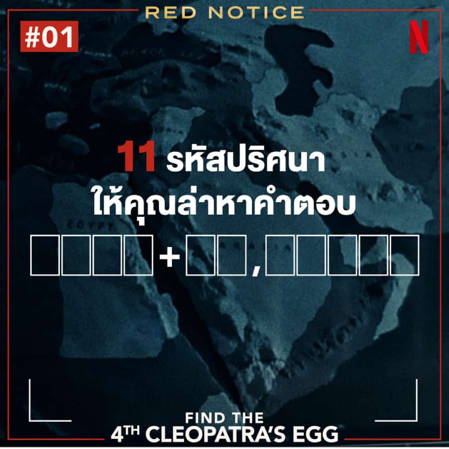 Red Notice คือ ภาพยนตร์แอ็คชั่นไล่ล่าข้ามโลก แบบที่ไม่รู้ว่าใครจะจับใคร เริ่มฉายเมื่อวันที่ 12 พฤศจิกายนนี้ ทาง Netflix และความสนุกของการเดินทางผจญภัยที่ถ่ายทอดผ่านตัวละครหลักทั้งสาม ปลุกกระแสความเป็นนักล่าสมบัติล้ำค่าในตัวแฟน ๆ Netflix จึงตอบสนองด้วยกิจกรรม “ไล่ล่าไข่คลีโอพัตรา ใบที่ 4” ที่ต้องประลองไหวพริบกันแบบ Virtual Hunt! ชิงรางรางวัลมูลค่า 3 แสนบาท