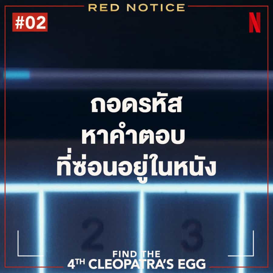 - การจะหารหัสดังกล่าวได้ คุณต้องถอดปริศนาชุดคำใบ้ 4 ชุด ที่จะเปิดเผยผ่าน เพจเฟซบุ๊กของ Netflix ทุกวันระหว่างวันที่ 17-20 พฤศจิกายน 2564 ใบ้ให้ว่า คำตอบทั้งหมดซ่อนอยู่ในหนังRed Notice แล้ว