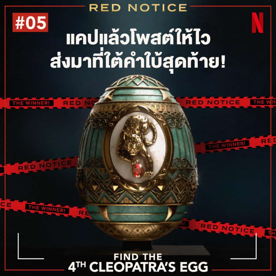 Netflix ปลุกความเป็นนักล่าสมบัติในตัวคุณ! ด้วยฝีมือฉกาจฉกรรจ์แบบนักโจรกรรมในภาพยนตร์ RED NOTICE กับ ‘ภารกิจไล่ล่าไข่คลีโอพัตราใบที่ 4’ โดยผู้ชนะเพียงหนึ่งเดียว จะได้รับไข่ล้ำค่าพร้อมทองคำ มูลค่ากว่า 3 แสนบาทไปครอง