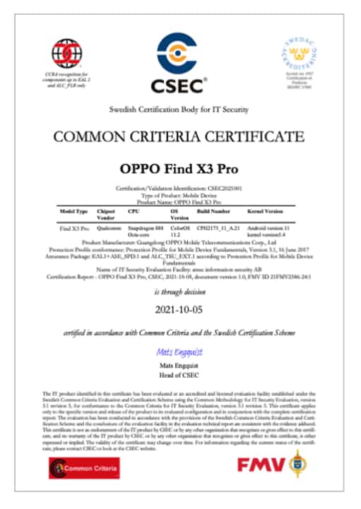 การรับรอง The MDFPP CC certification ที่ OPPO Find X3 Pro ได้รับนั้น ถือเป็นมาตรฐานการรับรองในระดับสากลที่เป็นที่ต้องการมากที่สุดในด้านของความปลอดภัยของอุปกรณ์แบบพกพา โดยการรับรองดังกล่าวจะระบุข้อกำหนดด้านความปลอดภัยพื้นฐาน 7 ข้อ ที่ครอบคลุมทุกขั้นตอนของการพัฒนาวงจรชีวิตผลิตภัณฑ์ รวมไปถึง smartphone security audit, cryptographic support, user data protection, identity and authentication, security management, target of evaluation access และ trusted path/channels การรับรองข้อกำหนดทางด้านเทคนิคทั้งหมด 178 การรับรองและ 155 กรณีของผู้ใช้งานได้ถูกวิเคราะห์ในการทดสอบหลายรอบ