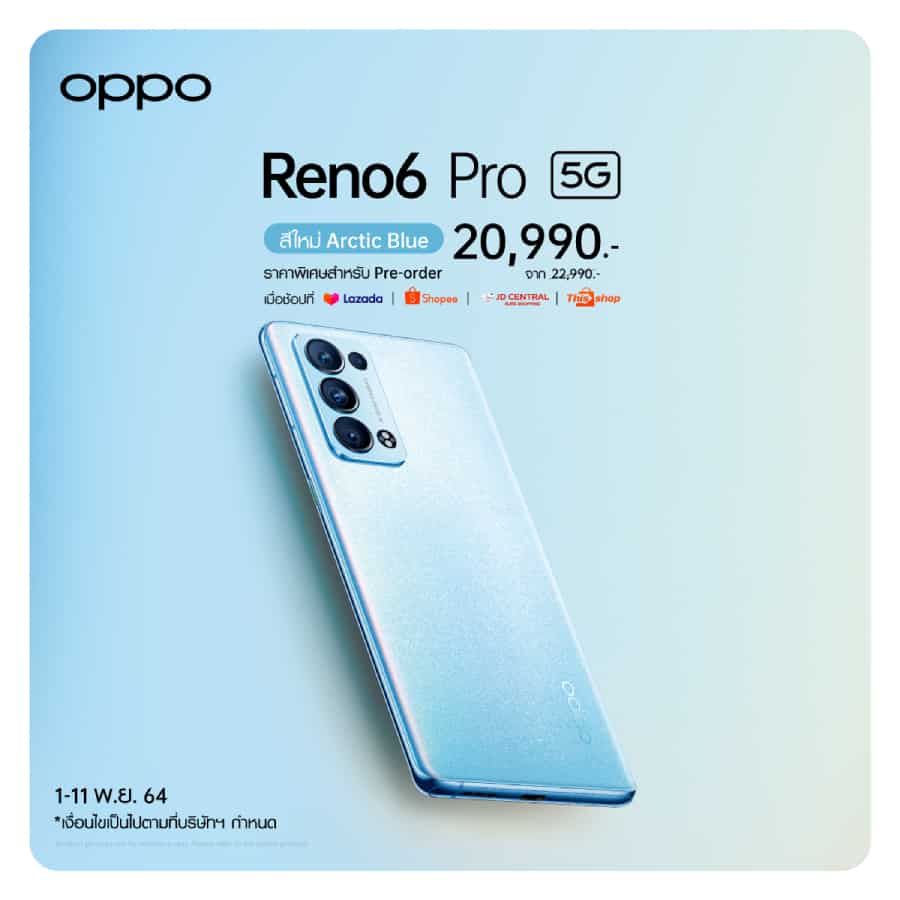 พิเศษ! เมื่อจอง OPPO Reno6 Pro 5G สี Arctic Blue รับส่วนลดเหลือเพียง 20,990 บาท จากปกติ 22,990 บาท ตั้งแต่วันที่ 1-11 พฤศจิกายน 2564 ที่ OPPO Official Store บน Lazada, Shopee, JD Central และ Thisshop